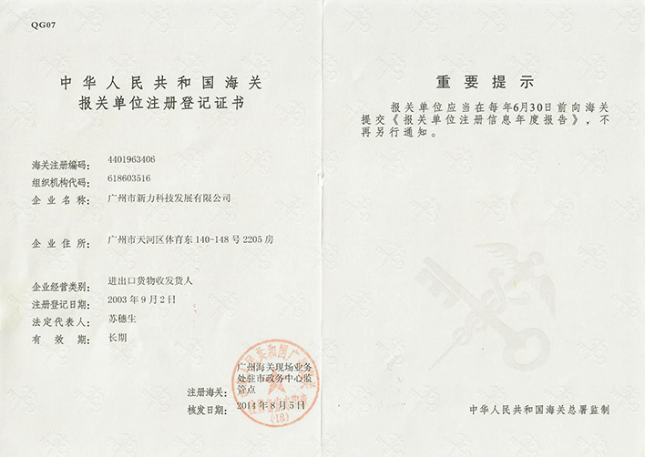 公司經廣州對外經貿易部核準,在中華人民共和國海關備案。