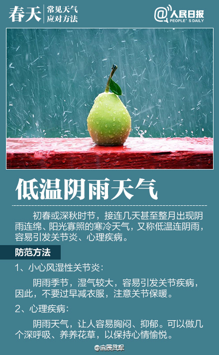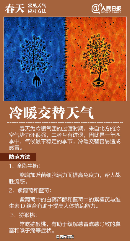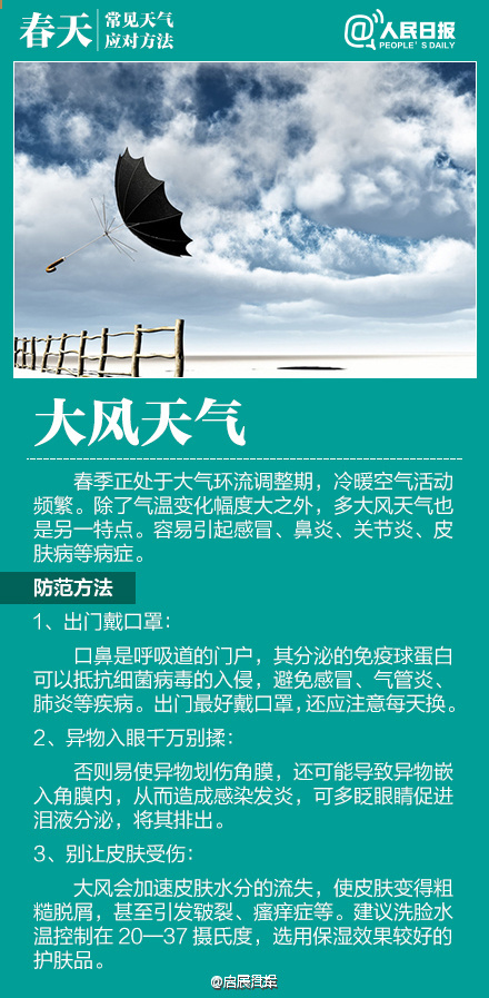 如何應對初春多變天氣作者:合眾電氣發布時間:2016-03-23瀏覽量:11037 次字體顯示:【大】【中】【小】 春季天氣調皮,昨天還日光融融閑賞花,今日就寒風瑟瑟緊添衣!大風、沙塵、陰雨等交替上演,讓感冒、過敏、關節炎等進入高發期。今天#世界氣象日#,四張圖教你應對春季多變天氣! 上一篇: HZXC-104D變壓器智能控制箱最新發貨現場下一篇: 面對問題疫苗,我們怎么辦?