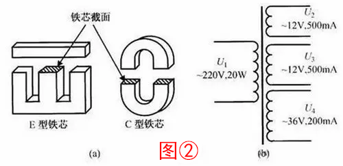 3、電源變壓器是最常用的一類變壓器。電源變壓器的主要參數(shù)是功率和次級電壓、電流。功率與鐵芯截面的平方成正比,如圖②(a)所示,鐵芯截面越大,變壓器功率越大。電源變壓器的用途是電源電壓變換,并可同時提供多種電源電壓,以適應電子電路的需要,如圖②(b)所示。制作時應根據(jù)需要選用具有符合要求的次級電壓、電流的變壓器。