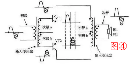 5、音頻變壓器工作于音頻范圍,具有信號電壓傳輸、分配和阻抗匹配的作用。圖④所示為推挽功率放大器電路,輸入變壓器將信號電壓傳輸、分配給晶體管VT1和VT2(送給VT2的信號還倒了相),使VT1和VT2交替放大正、負半周信號,然后再由輸出變壓器將信號合成輸出。輸出變壓器同時還將揚聲器的8Ω低阻變換為數(shù)百歐姆的高阻,與放大器的輸出阻抗相匹配,使得放大器輸出的音頻功率最大而失真最小。