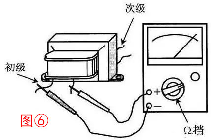 7、變壓器可以用萬用表進行檢測(圖⑥)。一是檢測繞組線圈通斷,二是檢測繞組線圈之間的絕緣電阻,三是檢測繞組線圈與鐵芯之間的絕緣電阻。