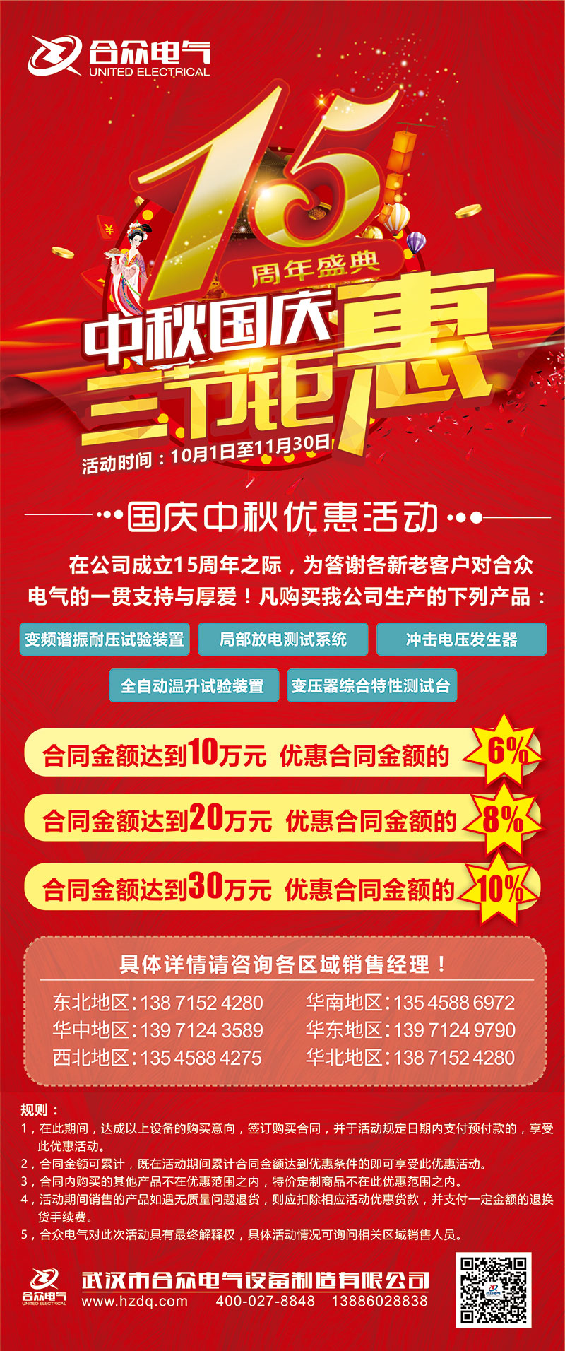 中秋國慶佳節(jié)即將來臨,在這個美好而又祥和的時候,也正值我司成立十五周年的誕辰,在這個三節(jié)同慶的日子里,我司為了回饋各位新老客戶多年來對我司的信任和支持,現(xiàn)正式啟動“合眾十五載,感恩一路有你”為主題的國慶中秋優(yōu)惠活動,凡在10月1日至11月30日期間購買我司設(shè)備,合同金額達(dá)到一定金額將享受到巨額優(yōu)惠,詳細(xì)活動細(xì)節(jié)請看上圖,在近期有采購意向的朋友,請抓住這次千載難逢的大好機會,趕緊拿起手機行動起來吧!