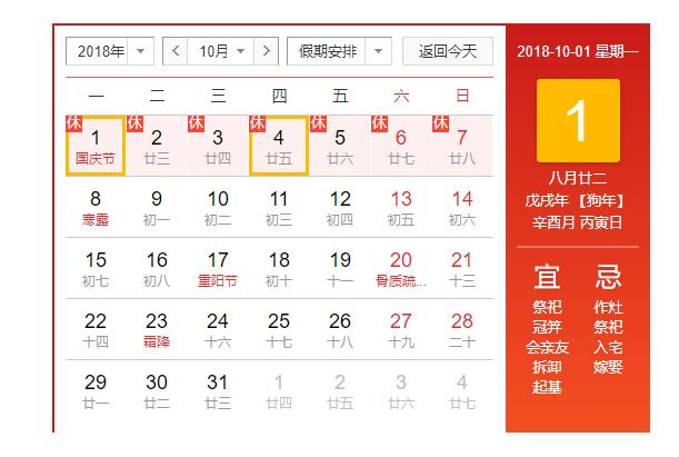 一、國慶節放假時間為:2018年10月1日(周一)至2018年10月7日(周日),放假共7天假期,2018年10月8號(周一)正常上班。2018年9月29日(星周六)、9月30日(周日)為正常上班。