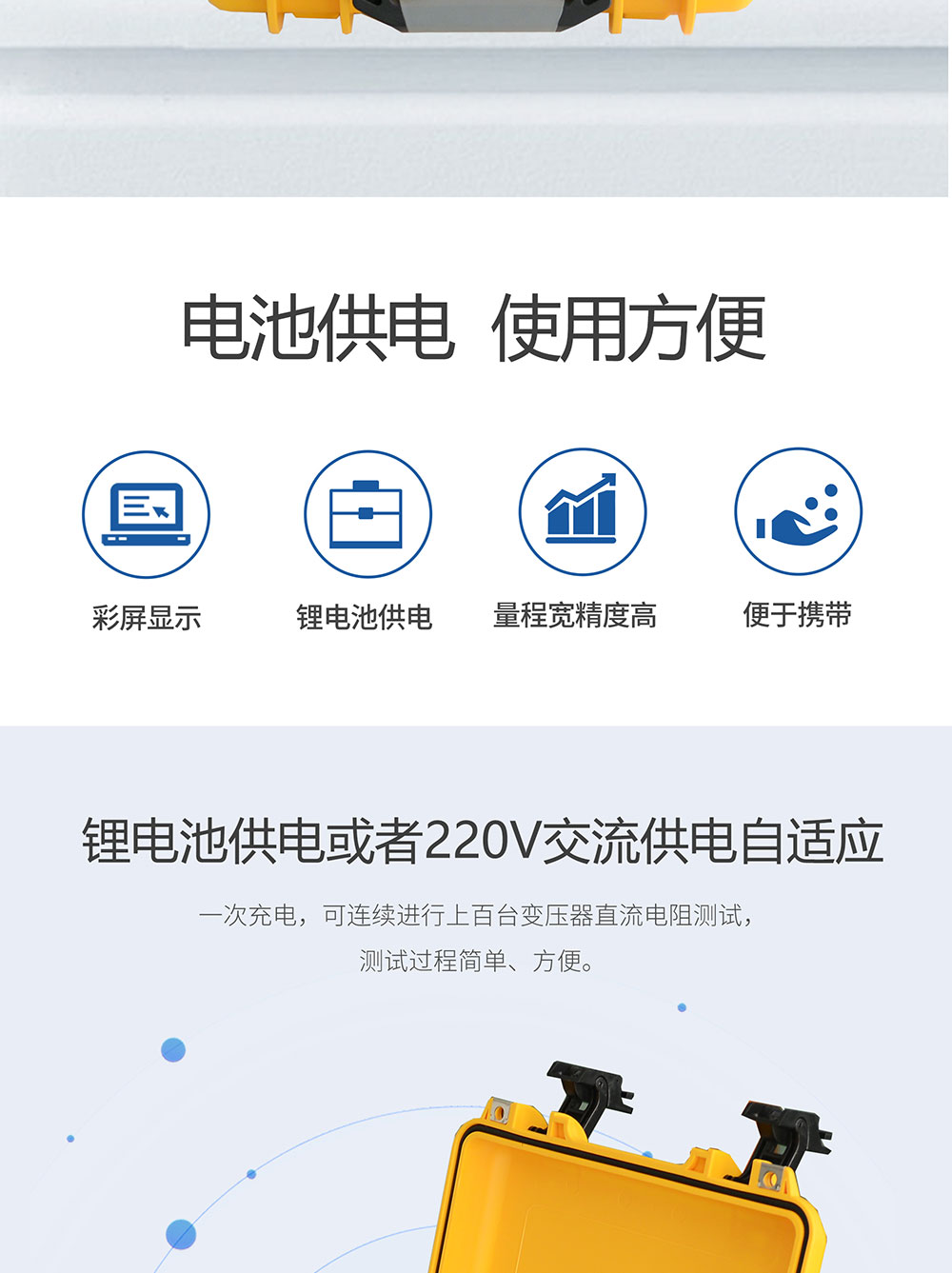 1、鋰電池供電或者220V交流供電自適應(yīng),一次充電,可連續(xù)進(jìn)行上百臺(tái)變壓器直流電阻測(cè)試,測(cè)試過(guò)程簡(jiǎn)單、方便。