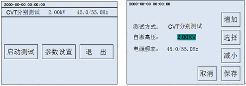 首先根據(jù)相應(yīng)的接線提示接好儀器外部的連線,然后點(diǎn)擊主界面“CVT測(cè)試”選項(xiàng),進(jìn)入下一級(jí)CVT測(cè)試菜單(如圖5-5)。然后可以點(diǎn)擊“參數(shù)設(shè)置”進(jìn)去設(shè)置菜單(如圖5-5)進(jìn)行詳細(xì)的測(cè)試參數(shù)設(shè)置。分別點(diǎn)擊每個(gè)需要設(shè)置的項(xiàng)目,按“增加”“減小”或“選擇”來修改。修改完成后點(diǎn)擊“保存”即可保存剛才所修改的參數(shù)并返回CVT測(cè)試界面,點(diǎn)擊“取消”則不保存本次修改并返回CVT測(cè)試界面。