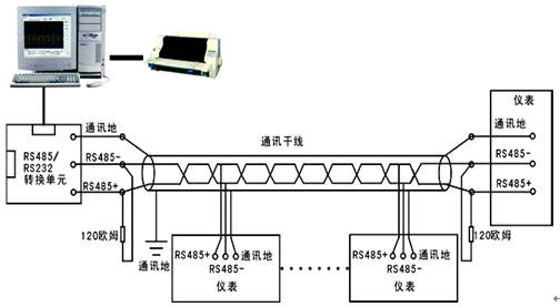 (1)本系列數(shù)據(jù)記錄儀的RS-485 通訊線采用屏蔽雙絞線,其一端通過RS-232/485 轉(zhuǎn)換模塊接到計(jì)算機(jī)的串行通信口,另一端接到記錄儀通訊端子。