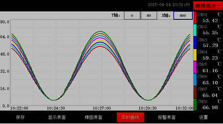 當(dāng)前曲線記錄只保留單屏的顯示數(shù)據(jù),可根據(jù)觀察的需要,通過(guò)改變Y軸和時(shí)標(biāo)X軸來(lái)改變顯示刷新的速度,各條曲線一致,并不影響FLASH記錄的時(shí)間間隔。