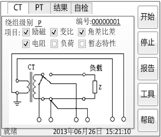 合眾電氣智能互感器測試儀用旋轉鼠標切換光標,選擇要進行的試驗項目,當光標停留在某個試驗項目時,屏幕顯示與該試驗項目相關的參數設置;當光標離開試驗項目時,屏幕顯示所選試驗項目所對應的接線圖。