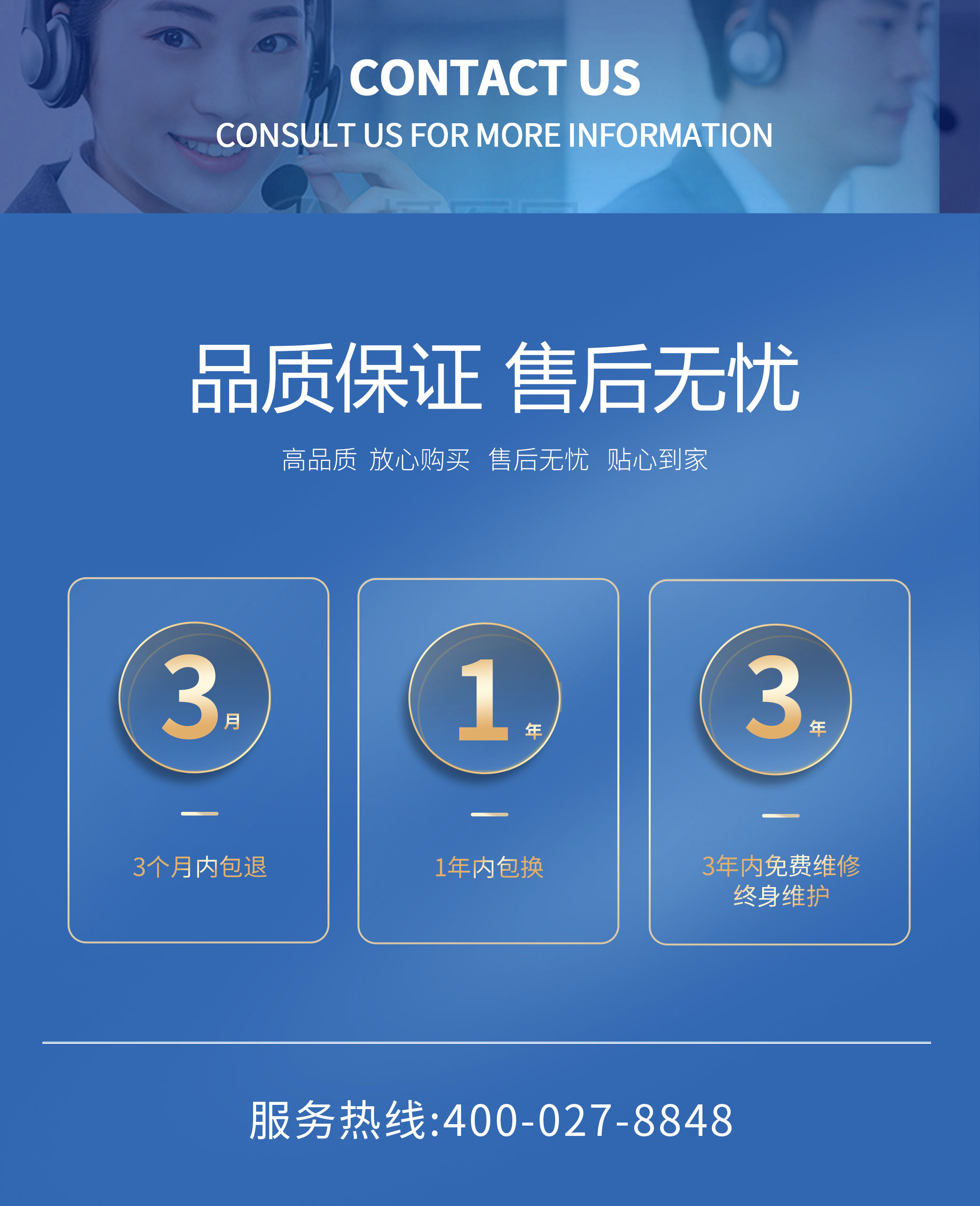 我們的售后服務承諾是:“3個月內包退,1年內包換、3年免費維修,終身維護”。在未來的日子里,我們將一如既往的堅持三類星級服務!